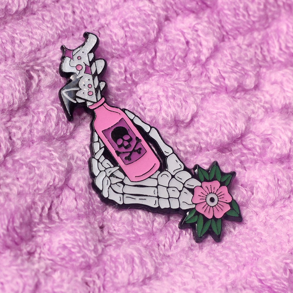 Skeleton hand holding poison bottle - anatomy - creepy cute - pastel goth - spooky - lapel pin badge