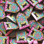 A cute pin featuring my illustration of a black cat in front of a colouful stained glass window!